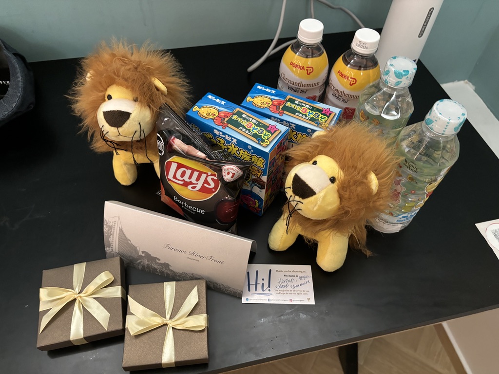 We were pleasantly surprised by these lion plushies and yummy treats.