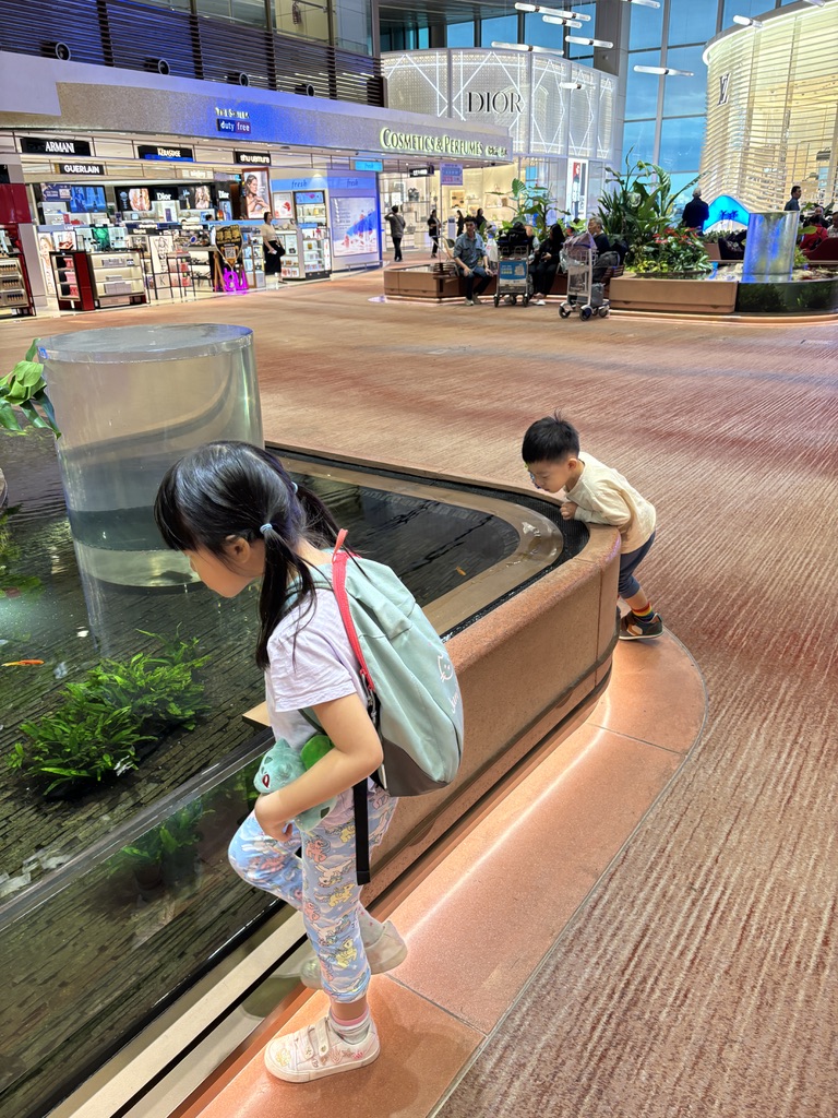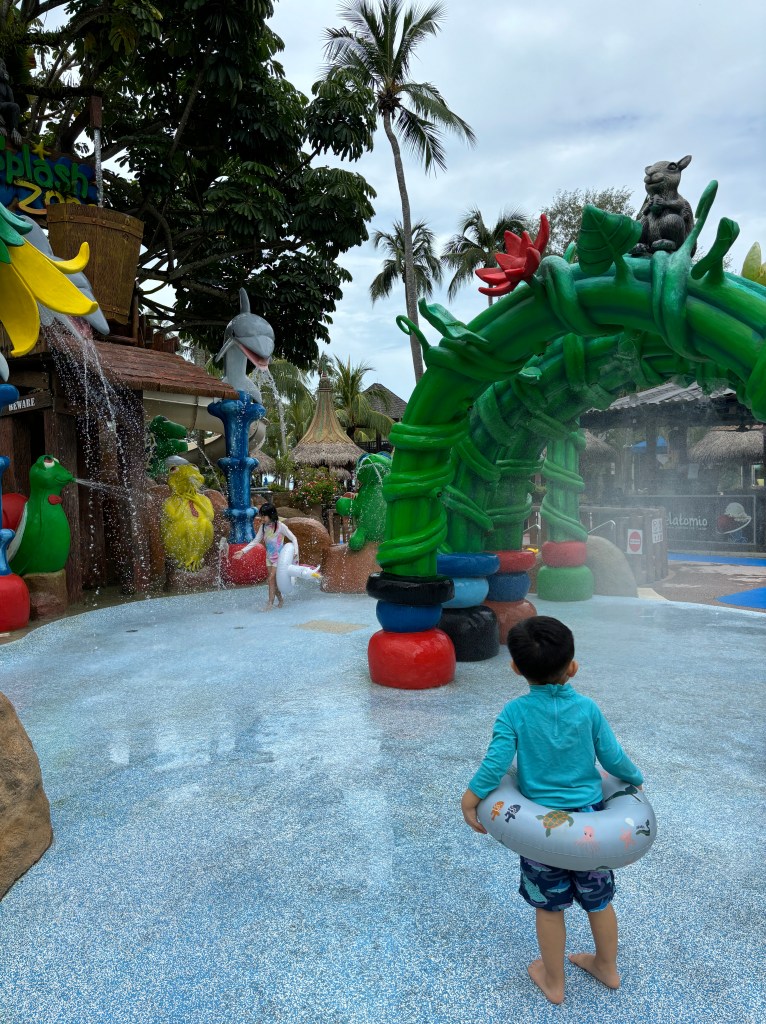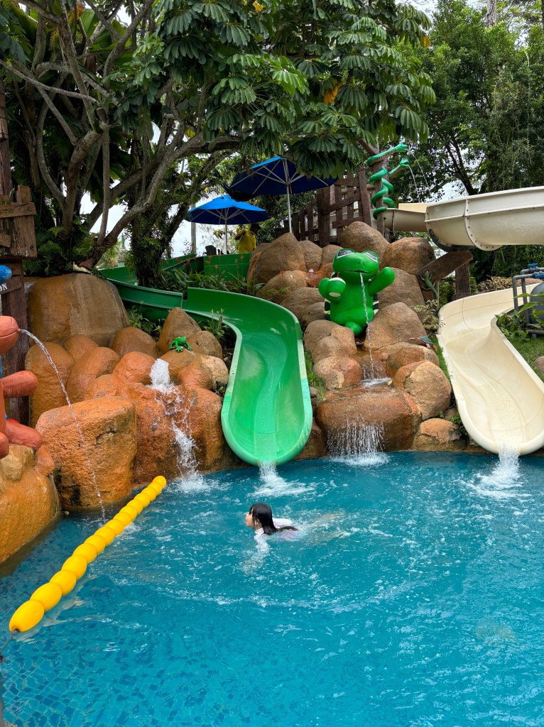 But what really made the kids’ eyes light up was the water play area. There’s a colourful splash zone with fountains and sprays, just right for toddlers and preschoolers to run wild safely. Next to it are two water slides that feeds into a shallow pool — exciting, but not intimidating. The whole area is shaded, and the soft flooring made it worry-free for us parents.