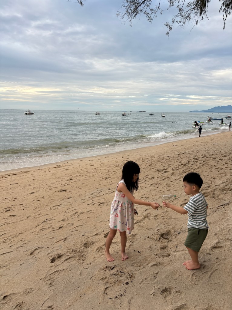 The kids chased waves and looked for seashells, their laughter carried by the breeze. We left our slippers behind and walked barefoot, taking it all in — the sound of the waves, the faint music from nearby stalls, the warmth of the day finally giving way to a gentle calm.