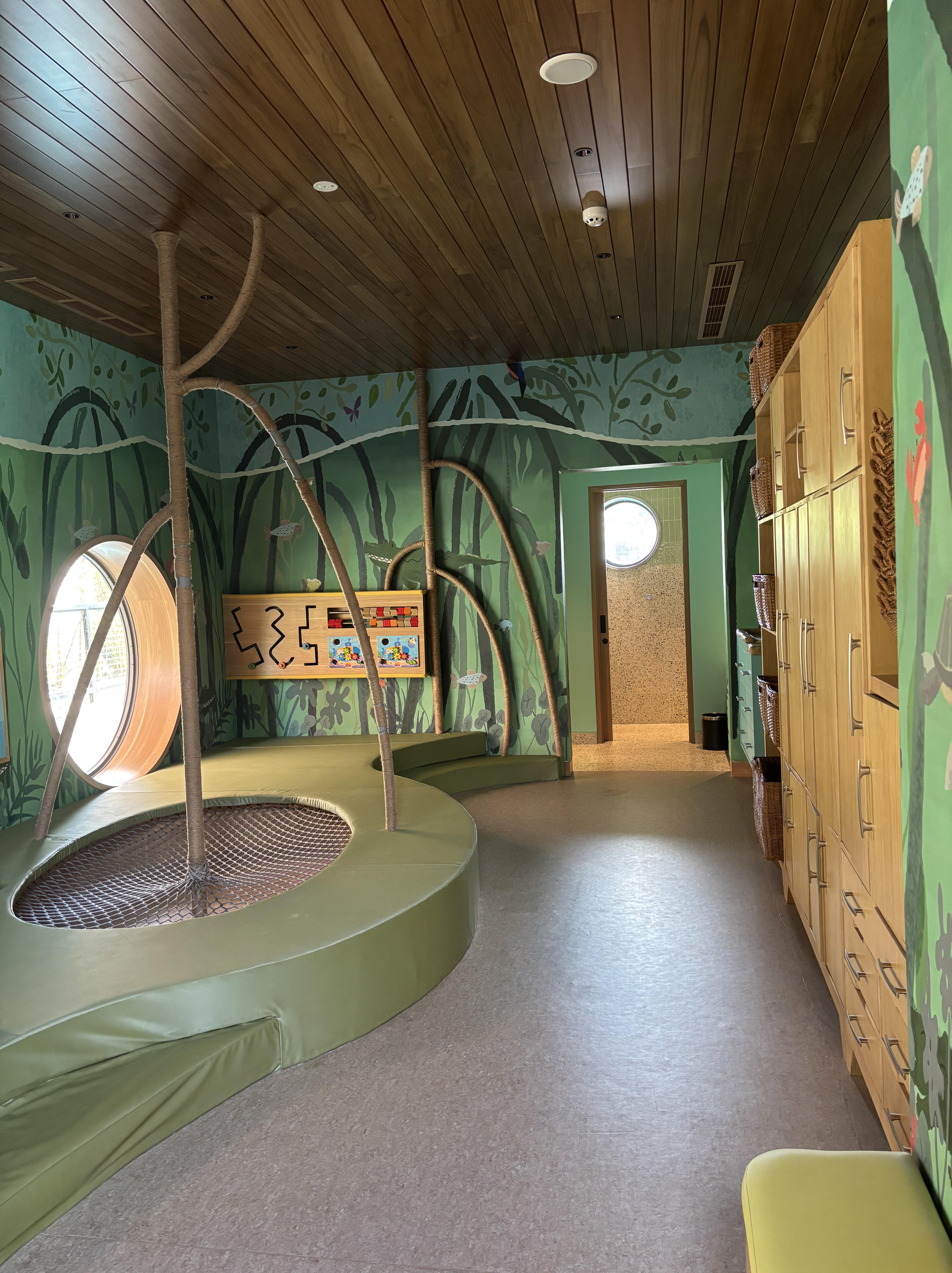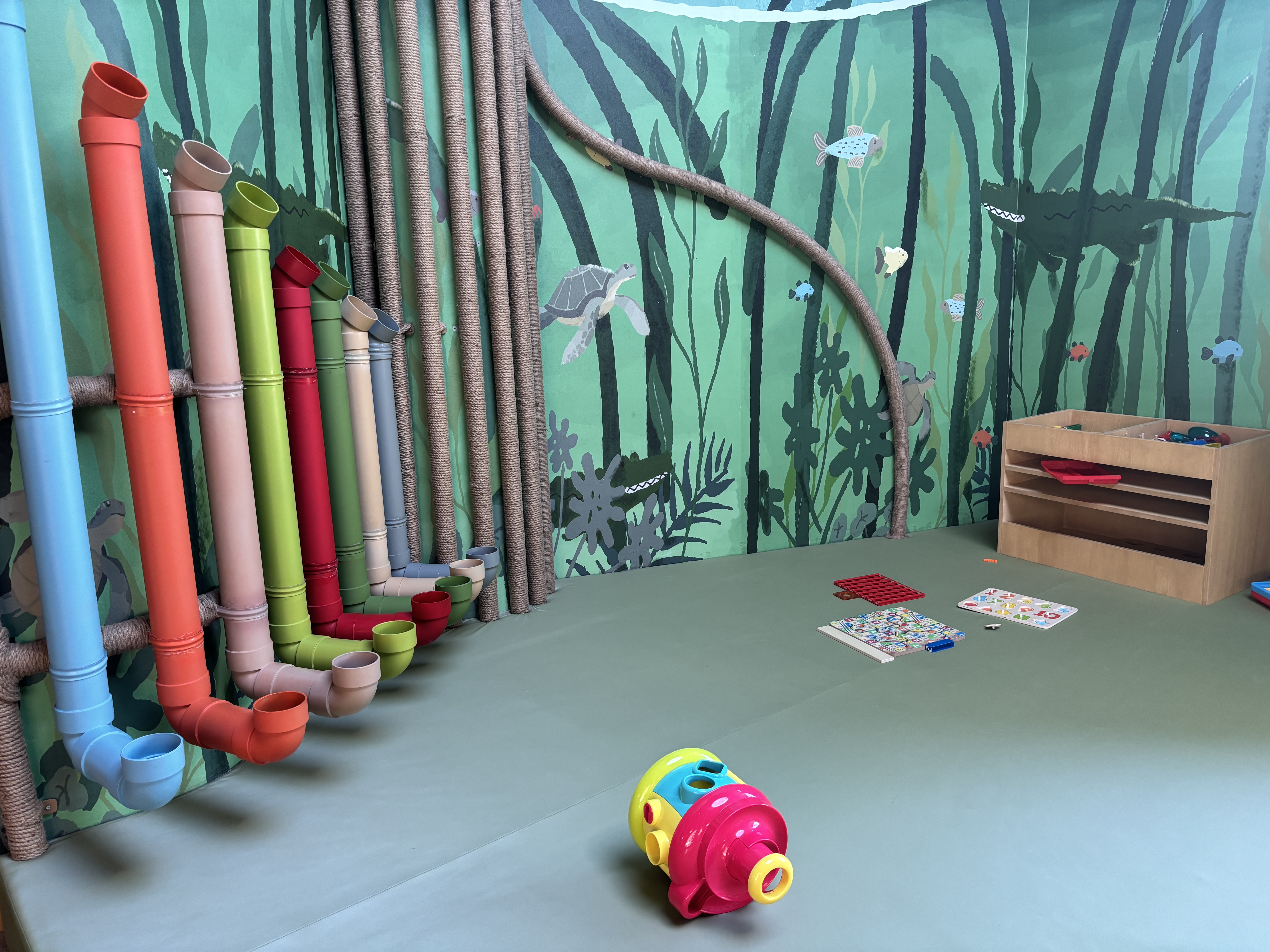 Inside, the play space seemed more thoughtfully designed than what we’d seen at other resorts on the island. There were two play zones, with one area with padded walls and soft flooring catering more to toddlers and one area with climb structures and slides for older kids. There is also a small room for movie screenings.