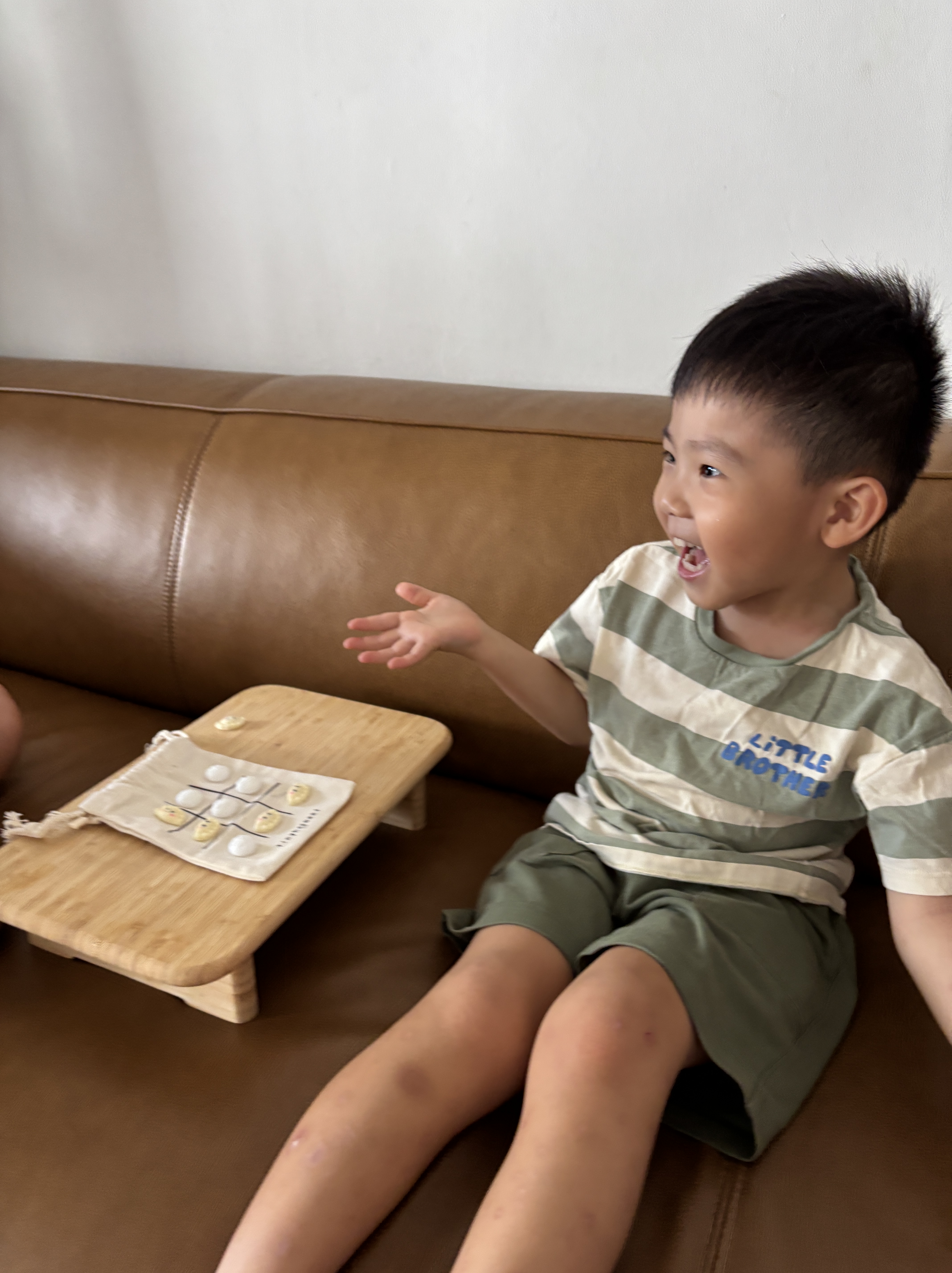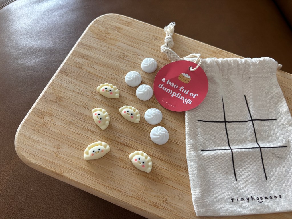 The set we picked is called A Bao‑Ful of Dumplings. The pouch is styled like a little lunch bag and doubles as the playing board. Inside are two sets of game pieces: one shaped like a bao, the other like a smiling curry puff. Everything fits inside, making it compact, quiet, and super kid‑friendly. We chose this design because “bao” is actually our boy’s nickname — so it felt like this set was made just for him.