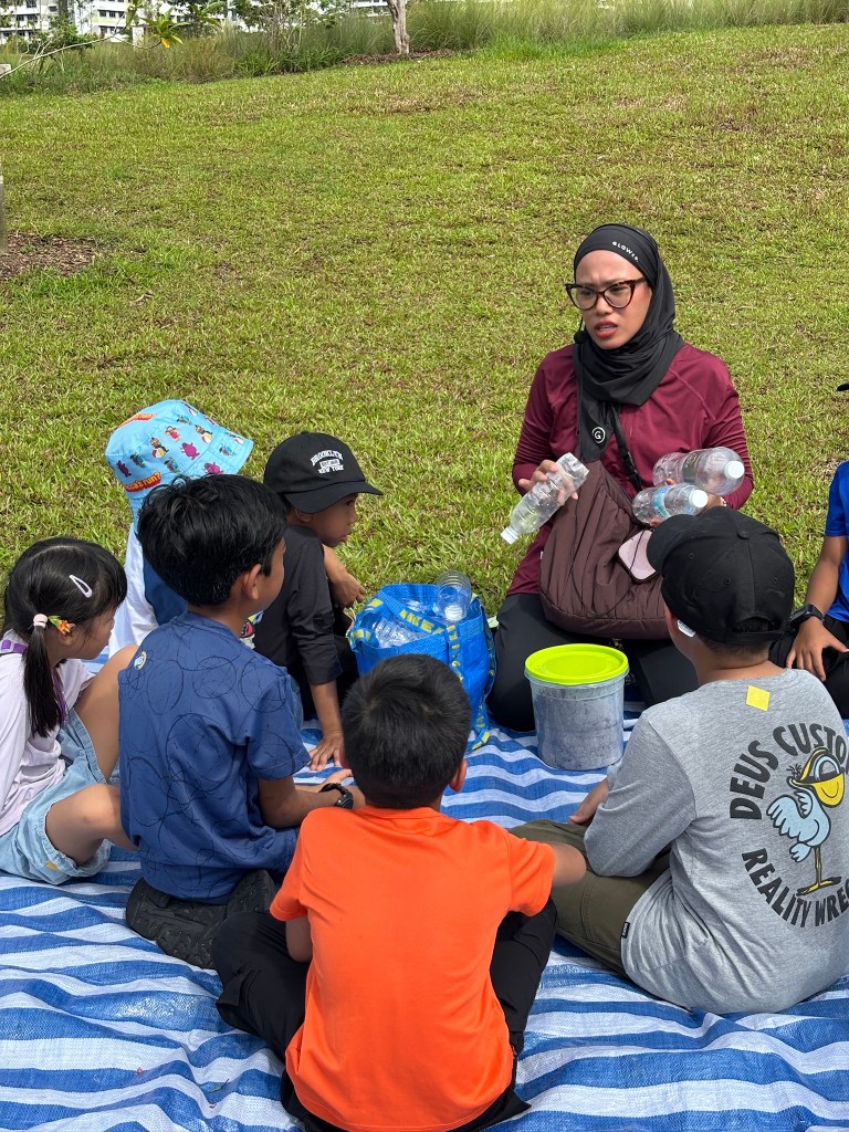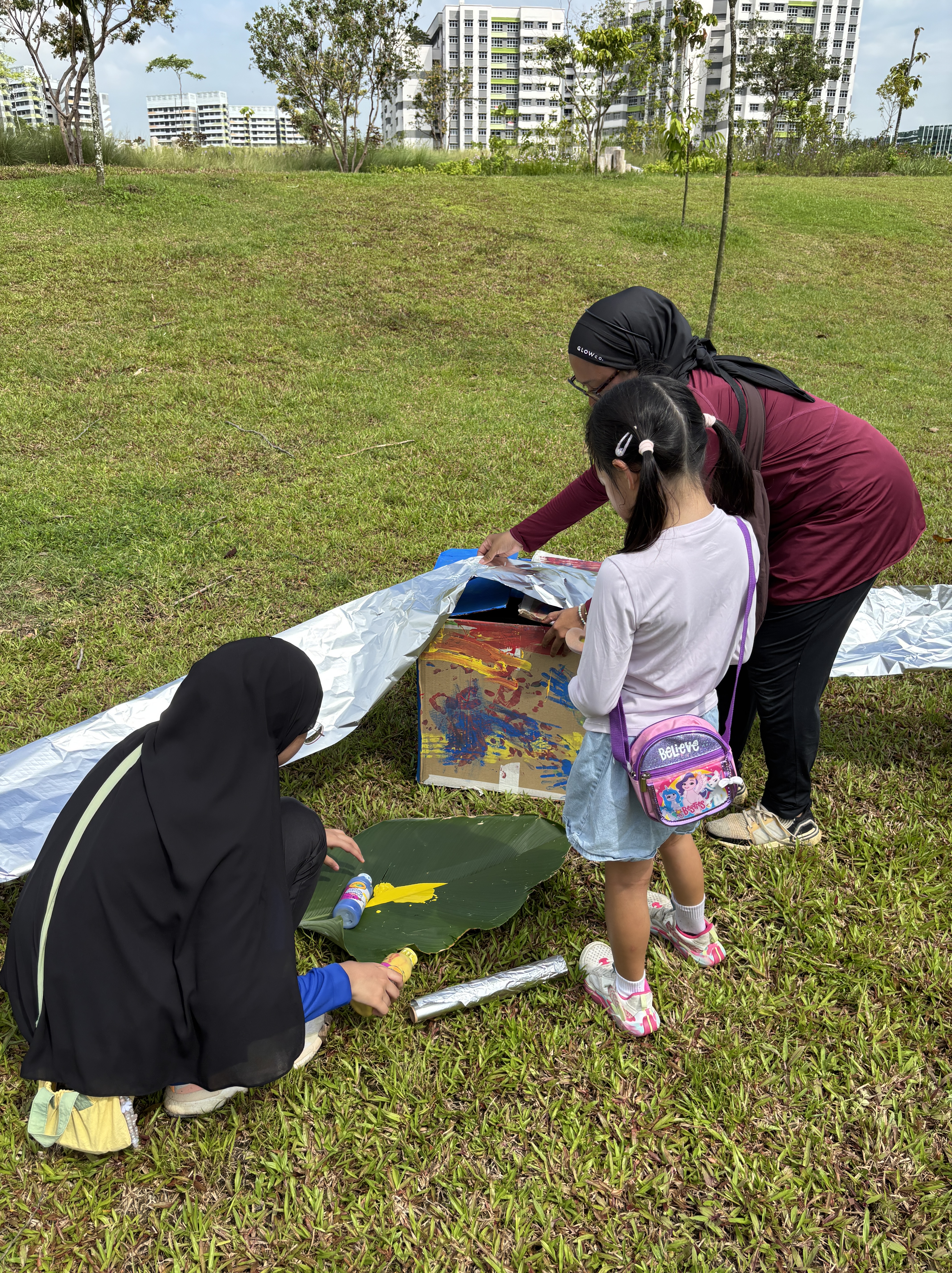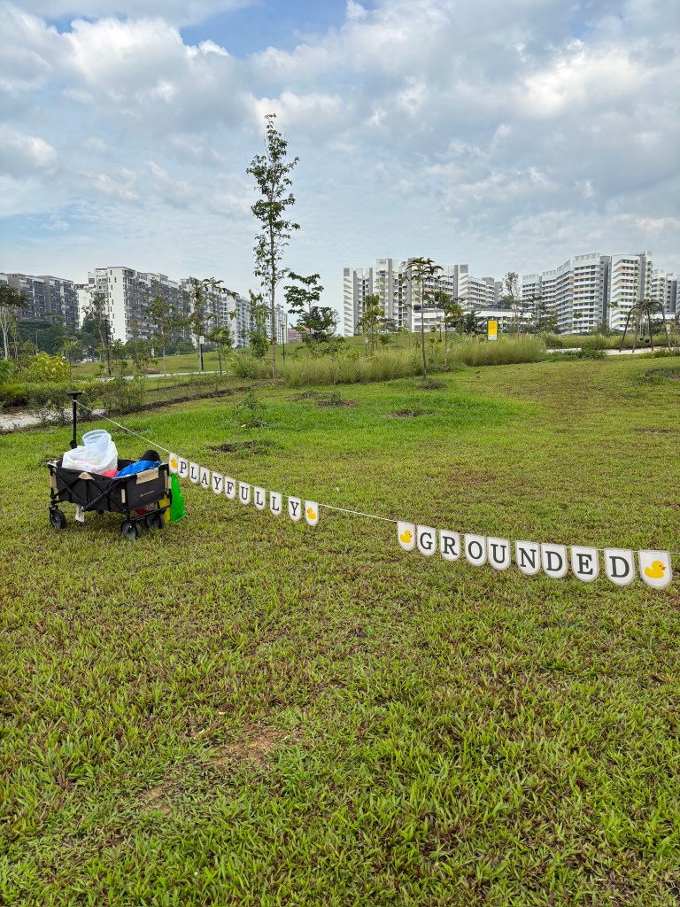 We arrived at the open field next to the MRT train tracks, with the nature garden as a backdrop. The facilitators had already laid out a simple but inviting setup: mats on the grass, art & science materials ready and a free play corner for later.