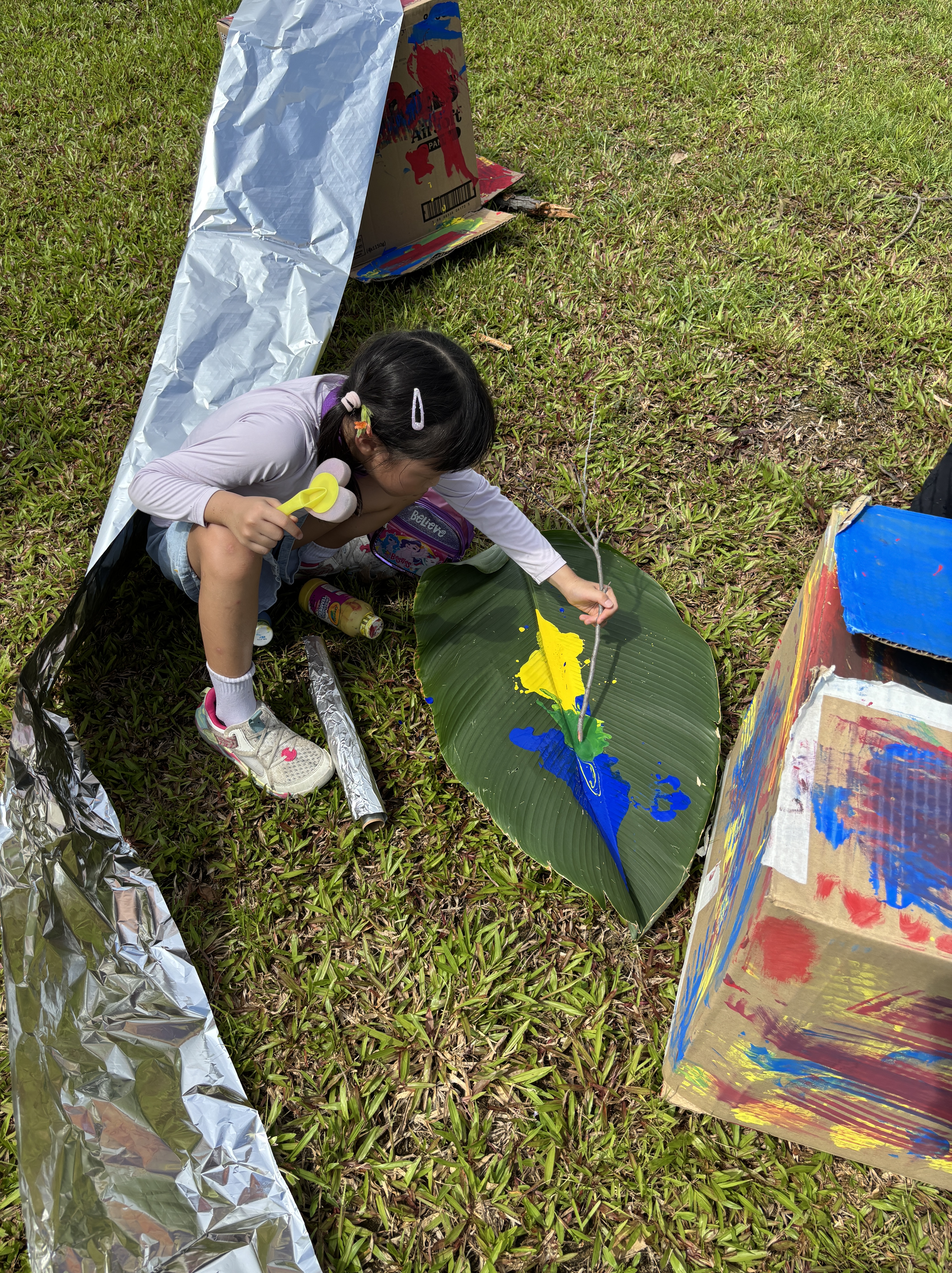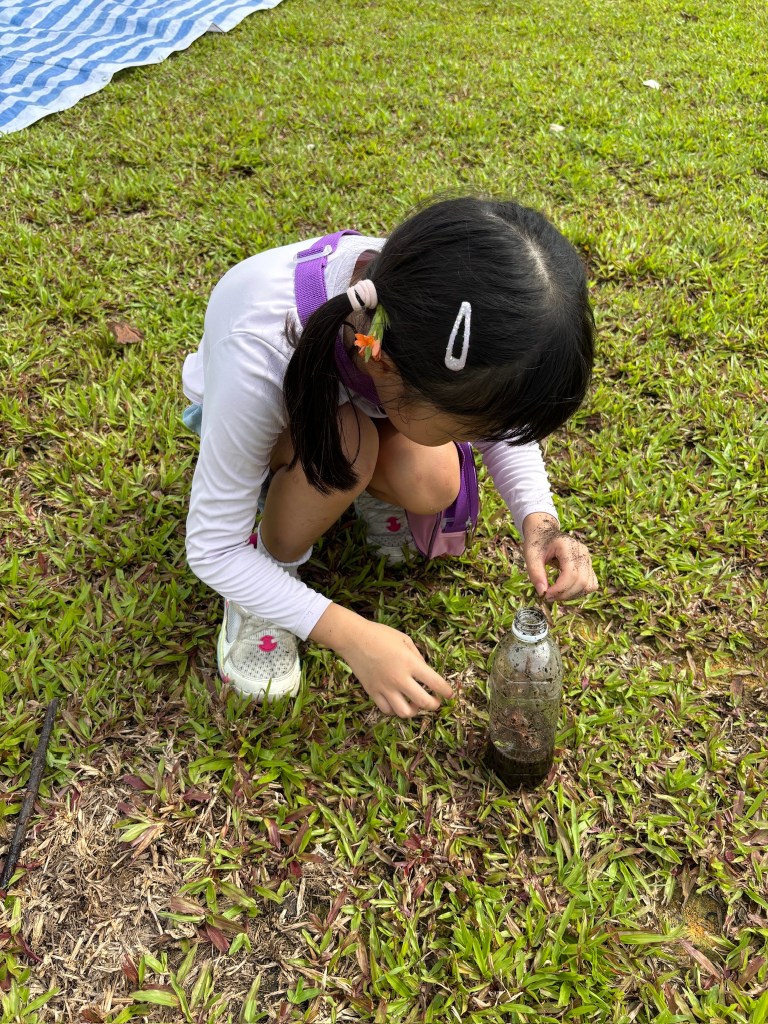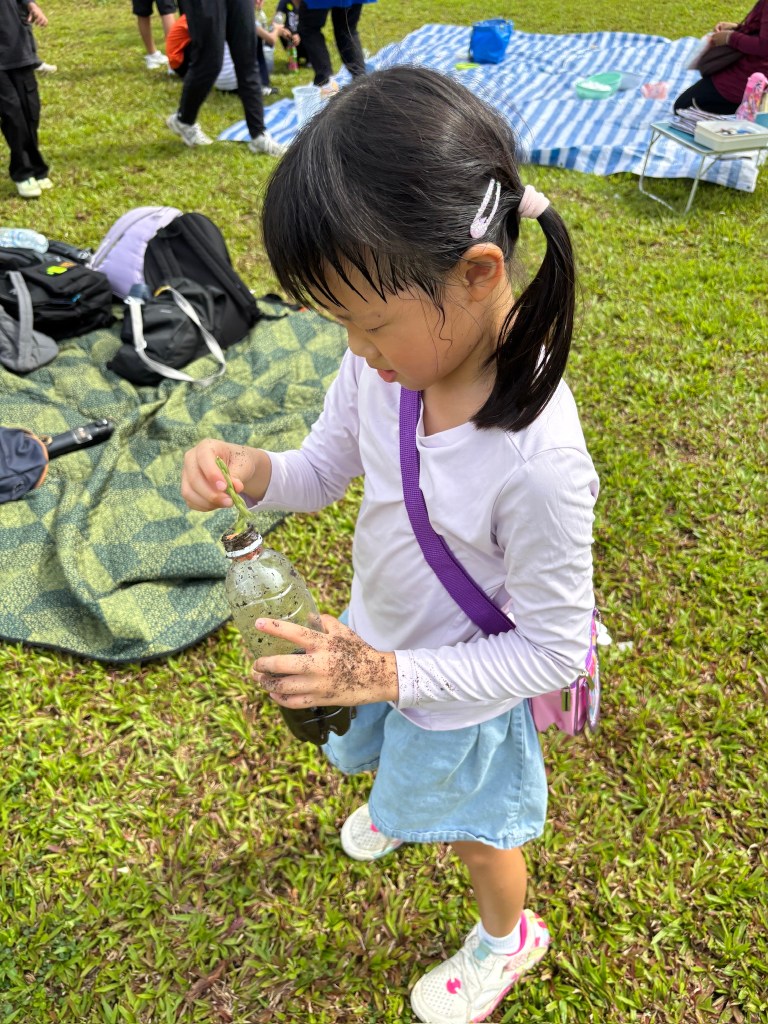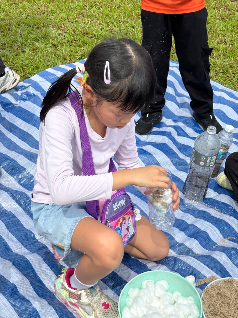 The highlight for many was the Water Filtration Challenge. First, the children gleefully mixed mud and dirt into bottles of water, imagining that this was the only water supply they had to survive in the wild. Their mission: make it drinkable.