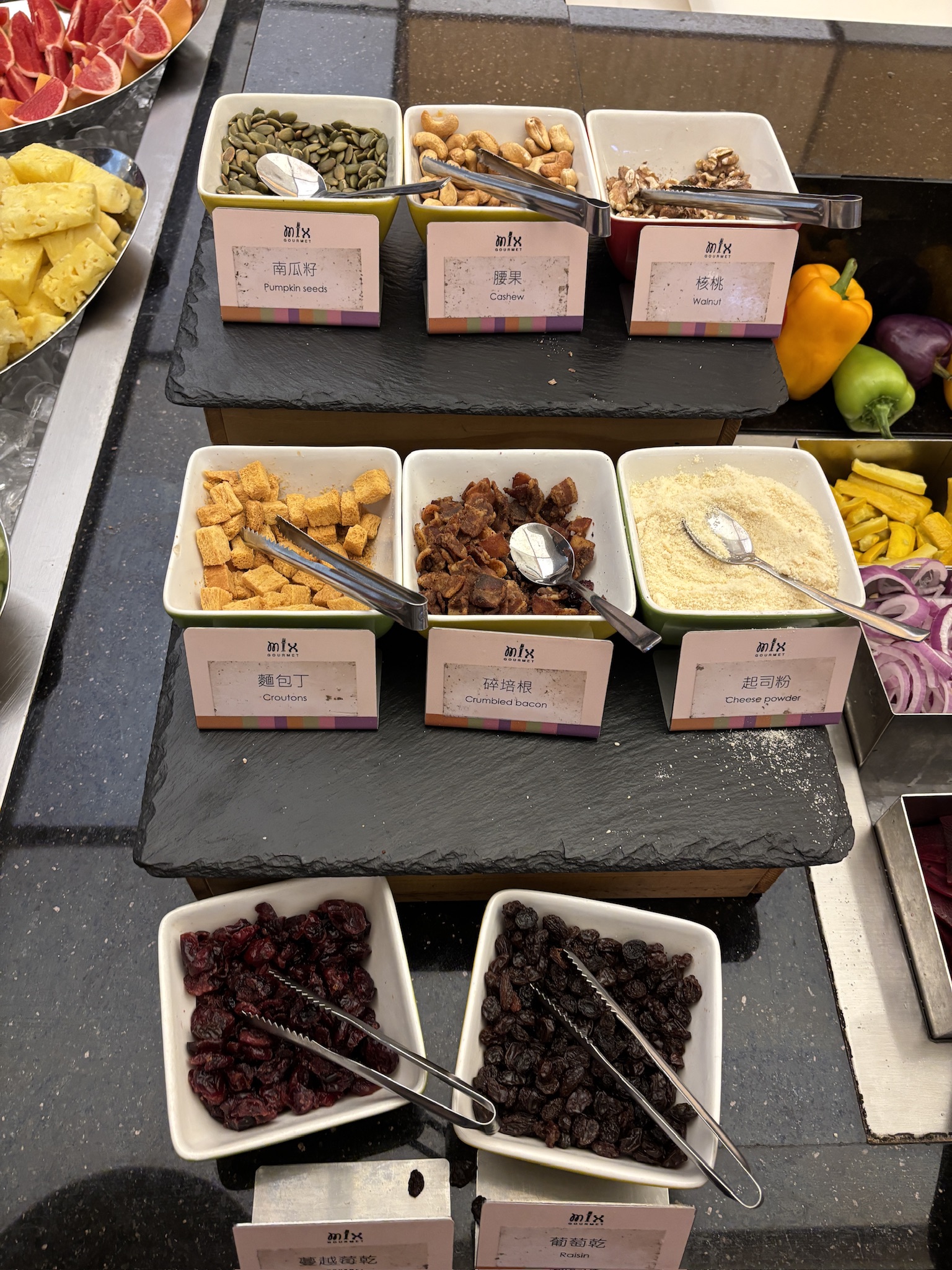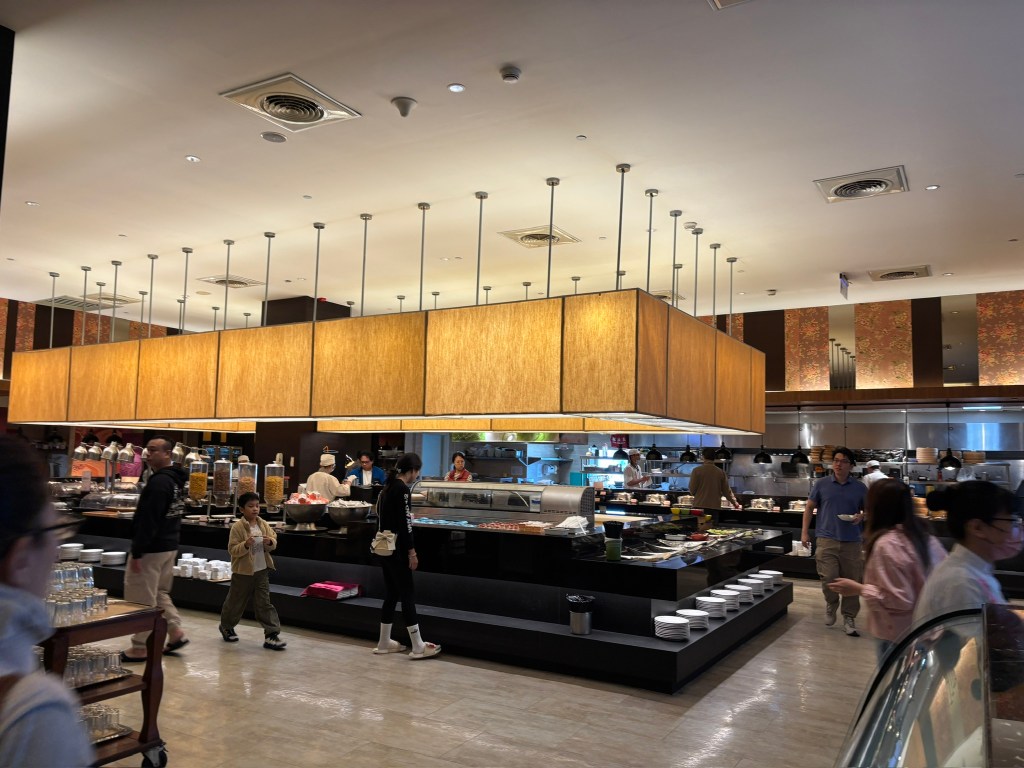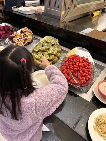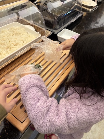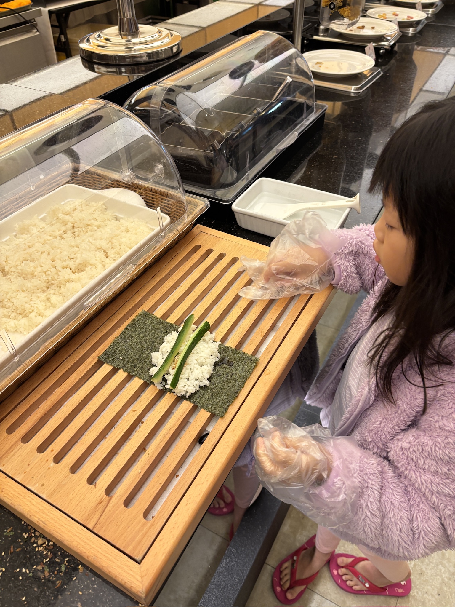 The buffet was genuinely kid-friendly, and not just in the predictable cereal-and-toast way. There were good-quality yoghurt options, milk packets, probiotic drinks and freshly squeezed juices. One of the biggest hits was the DIY sushi station, and J enjoyed assembling her own kappa maki.