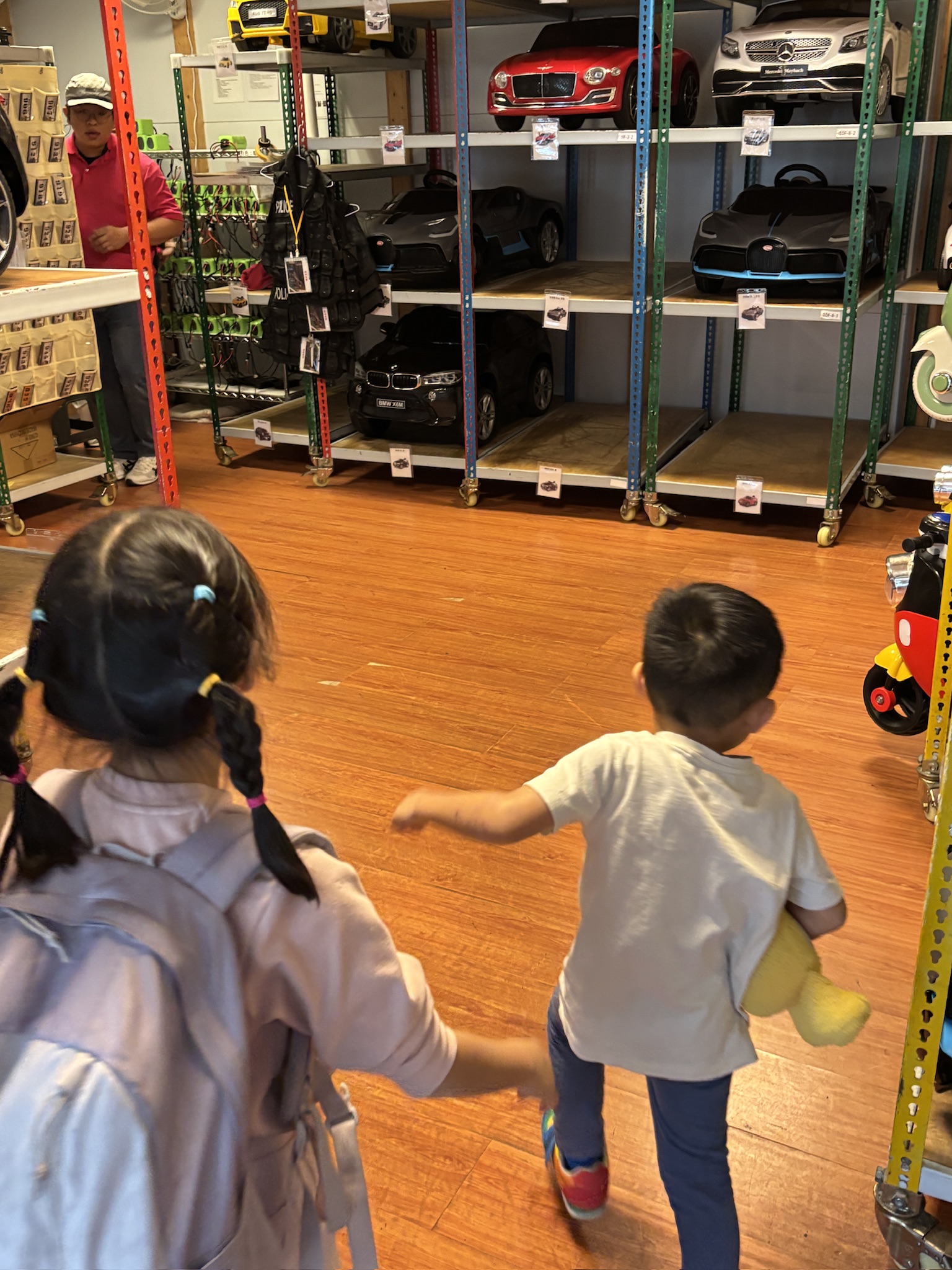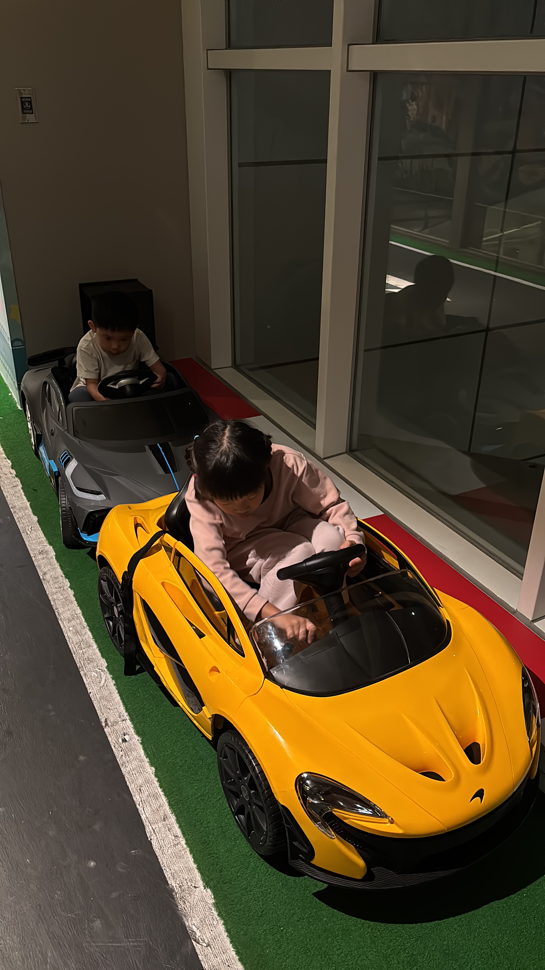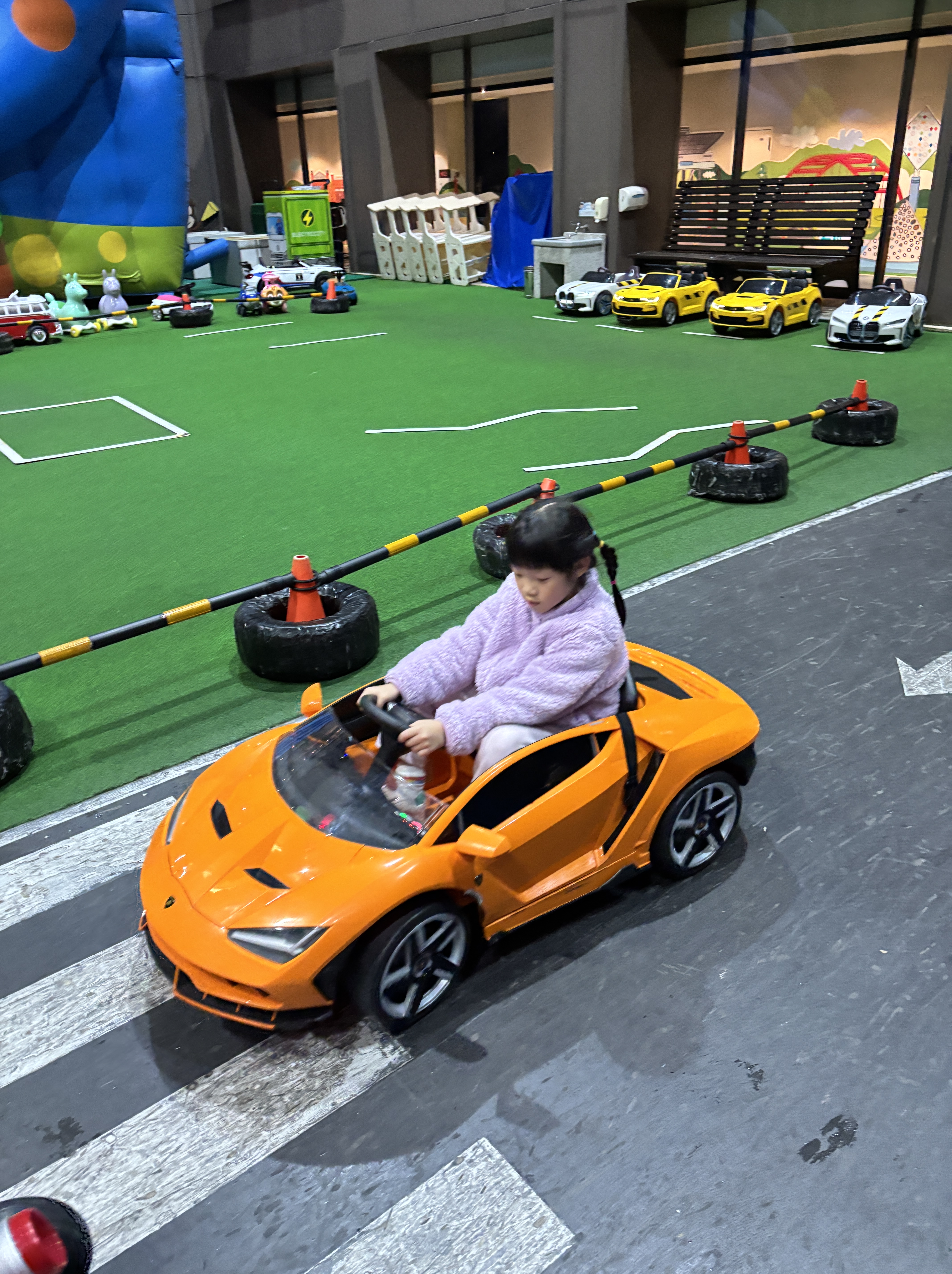 YB picked a stylish blue car that he absolutely loved and refused to part with. There were noticeably fewer choices for girls, though — only one pink car, which was already rented out. She ended up choosing a yellow car instead and was still happy as sunshine. Honestly, just having a car was exciting enough.