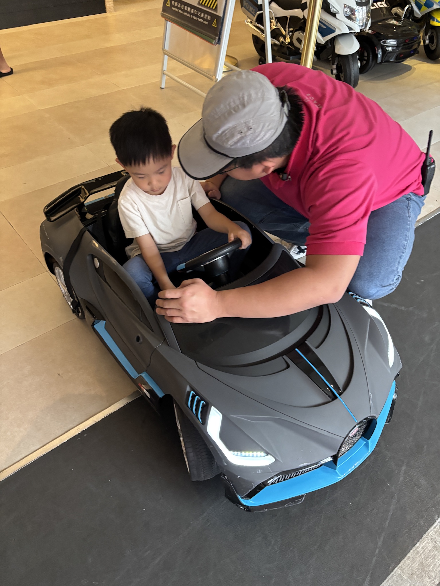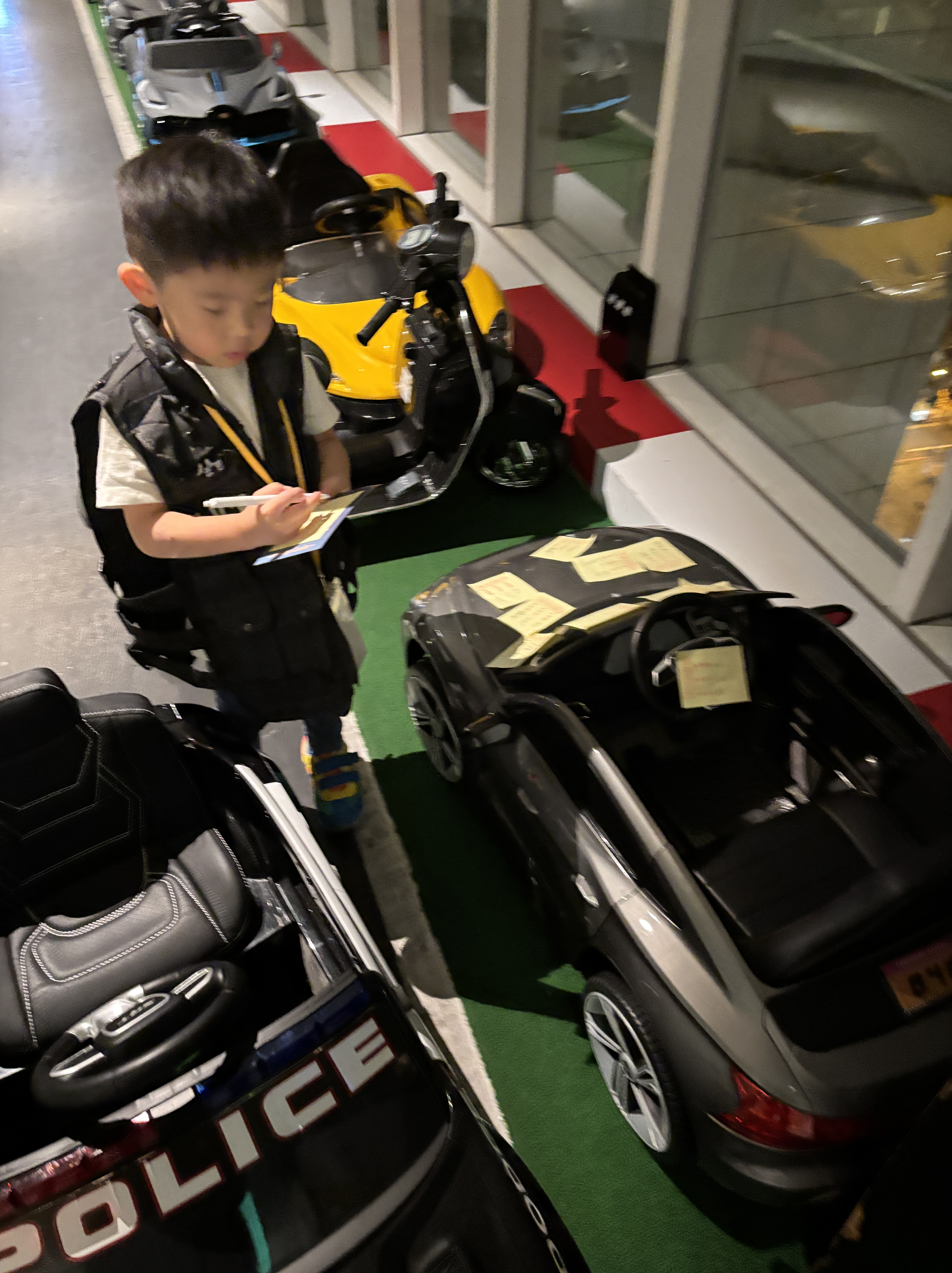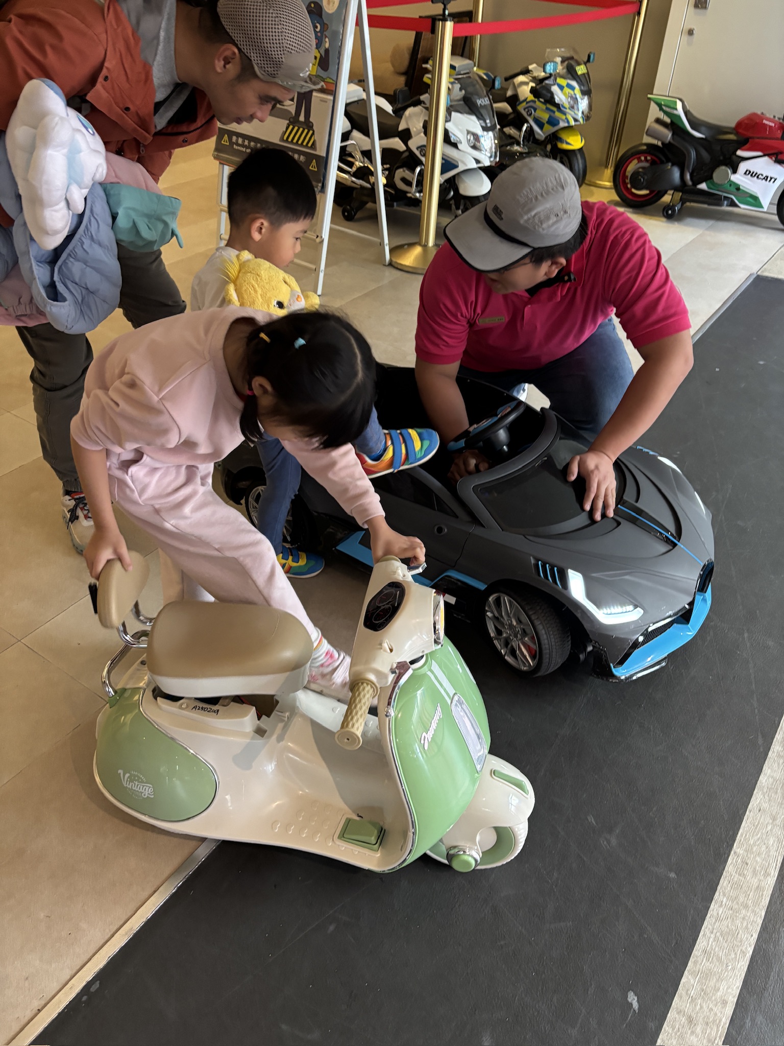 YB picked a stylish blue car that he absolutely loved and refused to part with. There were noticeably fewer choices for girls, though — only one pink car, which was already rented out. She ended up choosing a yellow car instead and was still happy as sunshine. Honestly, just having a car was exciting enough.
