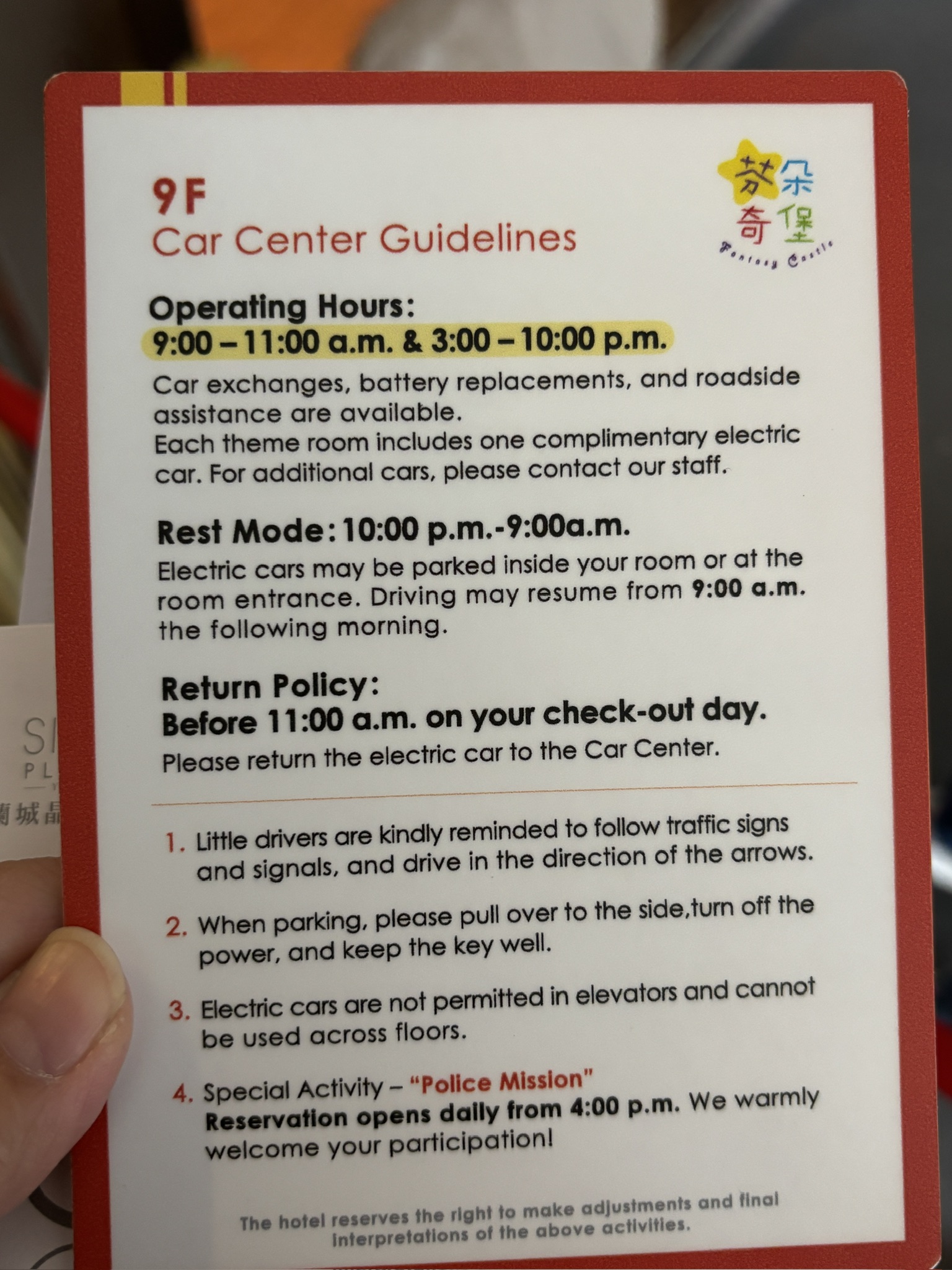 What the kids loved most was being able to try other cars here, not just the ones they’d chosen for their stay. Fantasy Castle closes at 8.30pm, which worked out perfectly for us. We headed there after dinner and still managed a good hour of play — just enough time for the kids to burn off energy without getting overtired. It was lively but not crowded and chaotic, and a really nice way to end the evening before heading back to the room.
