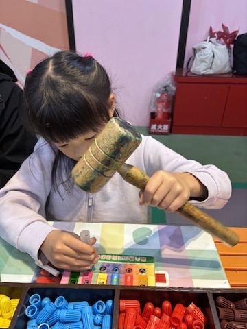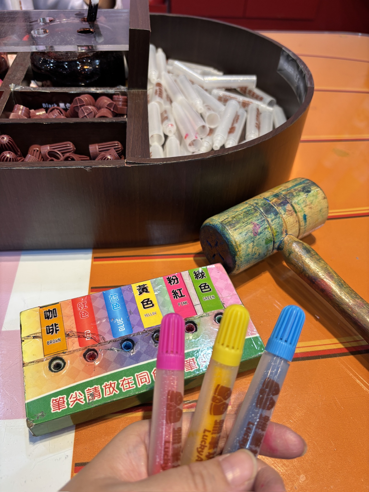 The second activity was our favourite: making markers from scratch. The kids had so much fun choosing their preferred colours — each ticket holder gets to make three markers — and learning how to dip the marker sticks so they could soak up the bright dyes. The final step involved hammering the parts together to seal the marker, turning loose components into a fully working pen.