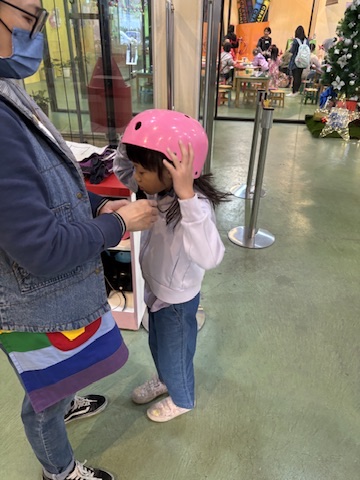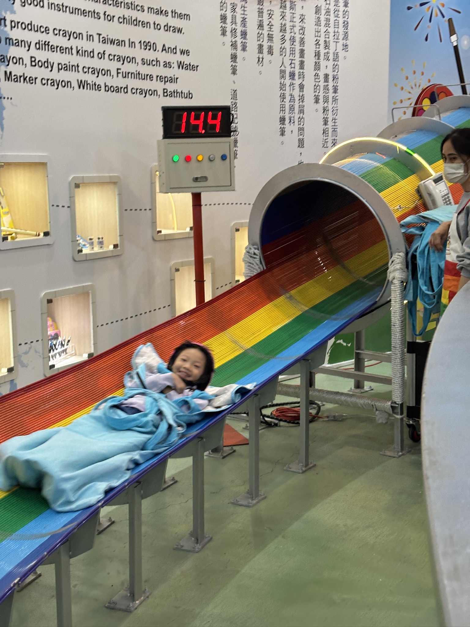 A staff came down to suit her up in a helmet and harness, and then led her upstairs to start the slide. We were told to wait at the end to take photos. While we were there, we could see her at the very top from a screen. It only took around 10 seconds for her to slide all the way down! She told us that it was actually a very smooth slide down, and the inside had piped-in music and lights so she didn’t feel scared at all.